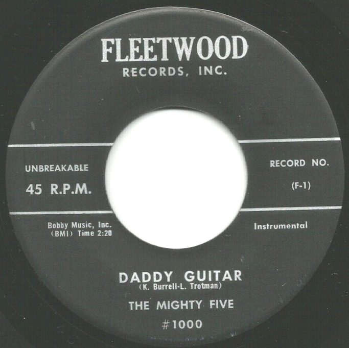 According to a list of Fleetwood Records’ 45s compiled by paisleyhaze.com, The Mighty Five’s “Daddy Guitar,” written by K. Burrell & L. Trotman, was the first single they released, #1000, backed with the B-side “Castle Rock.”